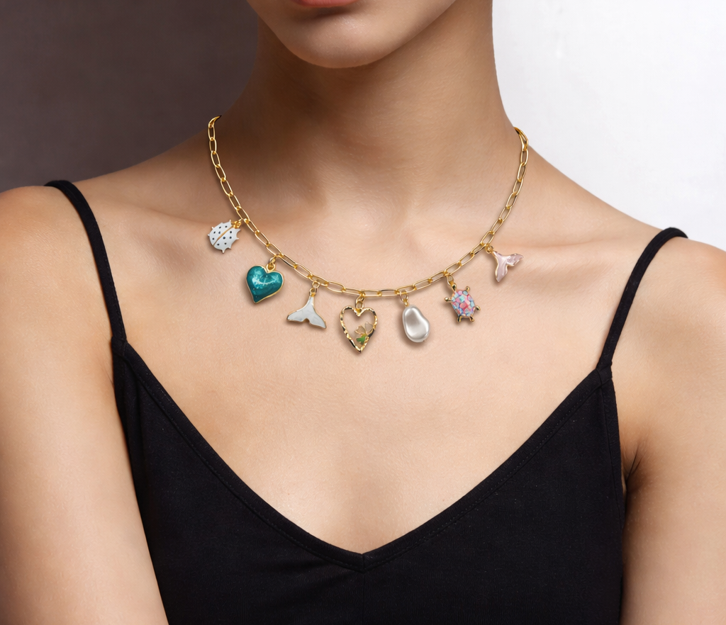 Gold Charm Necklace with Crystal Accents