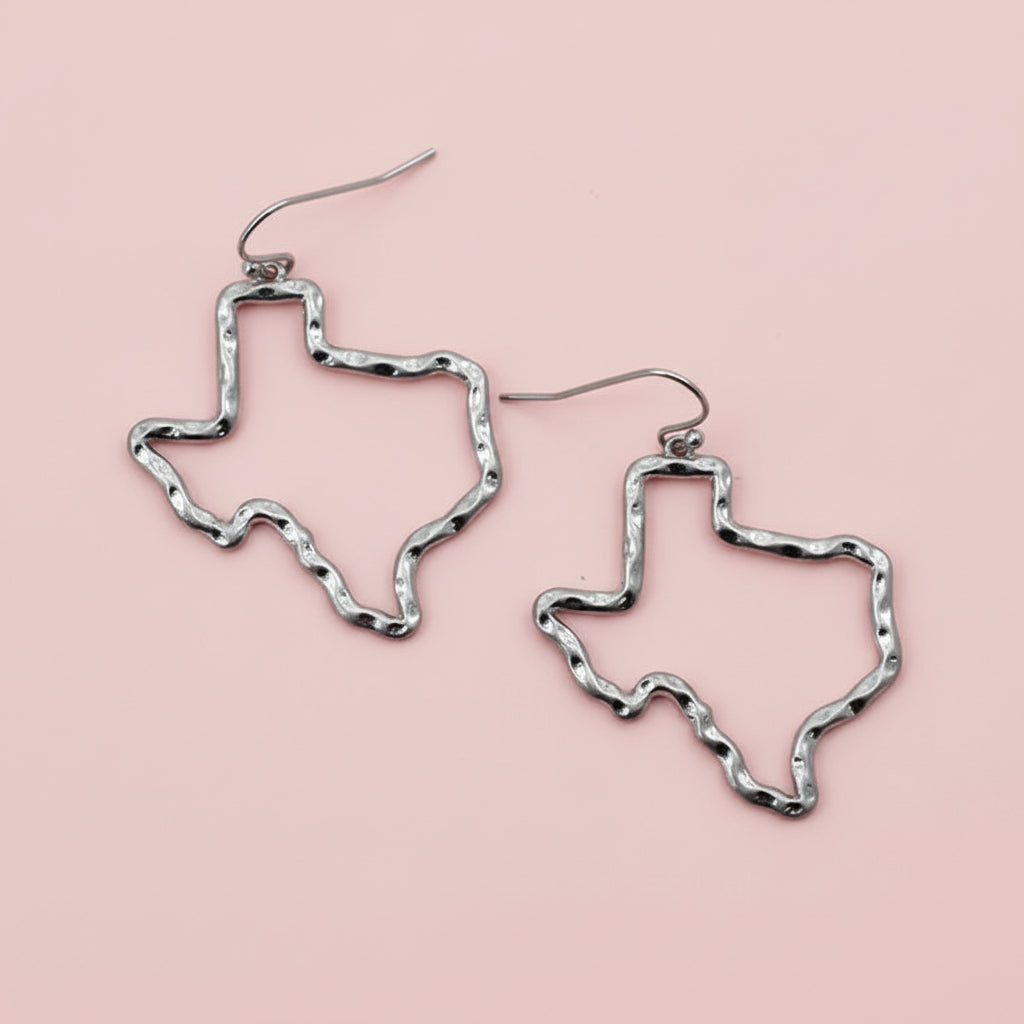 Gold tone, hammered finish state of Texas silhouette drop earrings. Measures about 1 inch in length and is very lightweight.